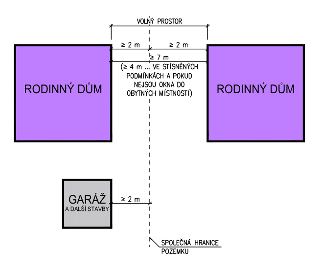 (2) Je-li mezi rodinnými domy volný prostor, vzdálenost mezi nimi nesmí být menší než 7 m a jejich vzdálenost od společných hranic pozemků nesmí být menší než 2 m. Ve zvlášť stísněných územních podmínkách může být vzdálenost mezi rodinnými domy snížena až na 4 m, pokud v žádné z protilehlých stěn nejsou okna obytných místností; v takovém případě se odstavec 4 nepoužije.