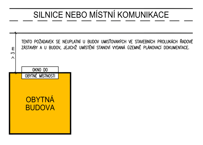 (7) Vzdálenost průčelí budov3), v nichž jsou okna obytných místností, musí být nejméně 3 m od okraje vozovky silnice nebo místní komunikace; tento požadavek se neuplatní u budov umisťovaných ve stavebních prolukách řadové zástavby a u budov, jejichž umístění stanoví vydaná územně plánovací dokumentace.