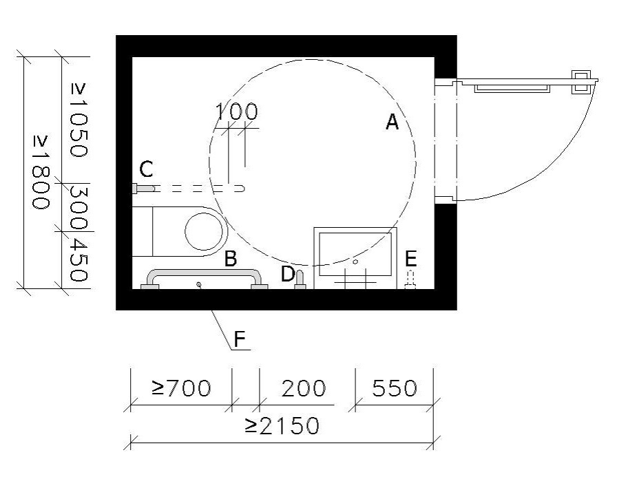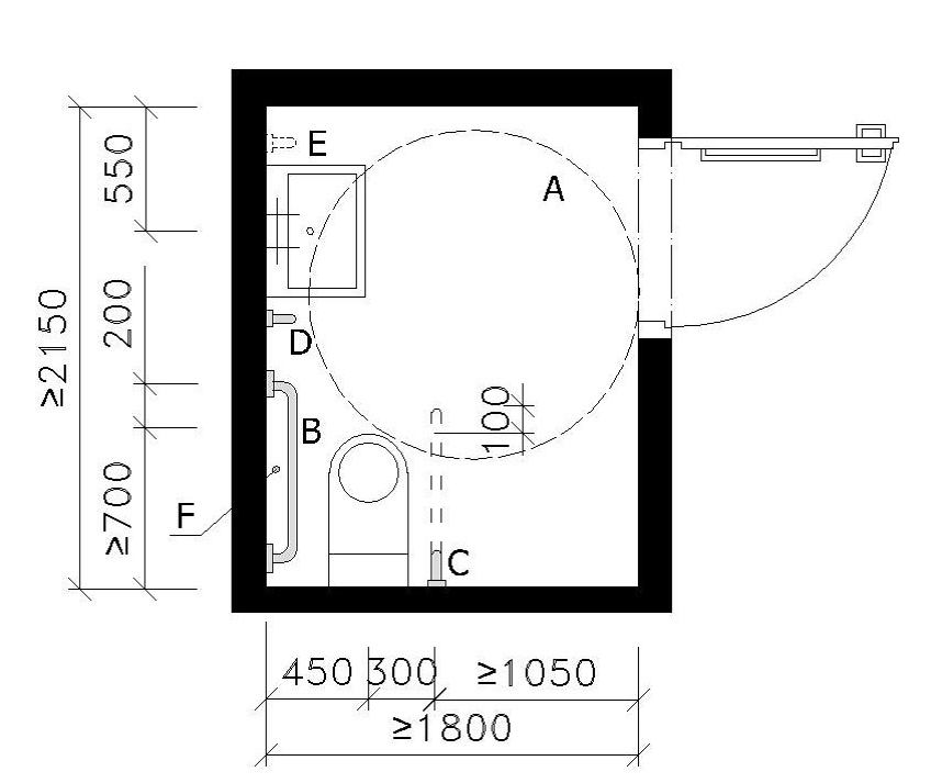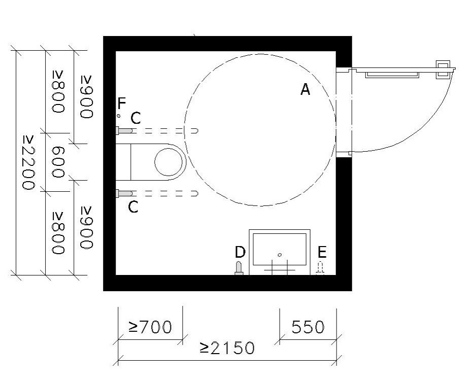 Legenda A – manipulační plocha – d=1500 mm B – místo pro přesedání C – vodorovné madlo D – svislé madlo E – svislé madlo (doporučeno pro chodícího uživatele) F – ovladač signalizačního systému nouzového volání