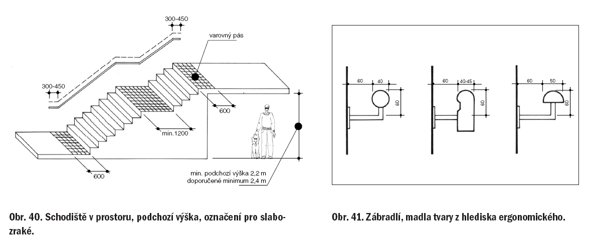 Ve všech ramenech téhož schodiště musí být stejný počet stupňů. Počet stupňů za sebou může být nejméně 3 a nejvíce 16. Sklon schodišťového ramene nesmí být vetší než 28o a výška schodišťového vyrovnávacího stupně větší než 160 mm, to neplatí pro stavby bytových domů s výtahem. Schodišťová ramena a vyrovnávací stupně musí být po obou stranách opatřeny madly ve výši 900 mm, která musí přesahovat nejméně o 150 mm první a poslední stupeň s vyznačením v jejich půdorysném průmětu. Madlo musí být odsazeno od svislé konstrukce ve vzdálenosti nejméně 60 mm.