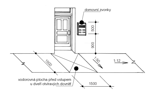 Před vstupem do objektu by měla být vodorovná manipulační plocha. Velikost a uspořádání vyplývá ze směru otevírání dveřního křídla. Jestliže se otevírá směrem do objektu postačí plocha o velikosti 1500 x 1500 mm. Při otevírání dveří ven musí být šířka nejméně 1500 mm a délka ve směru přístupu nejméně 2000 mm. Sklon plochy před vstupem do budovy smí být pouze v jednom směru a nejvýše v poměru 1:50 (2,0%). Vstup do objektu musí mít šířku nejméně 1250 mm. Hlavní křídlo dvoukřídlých dveří musí umožňovat otevření nejméně 900 mm.