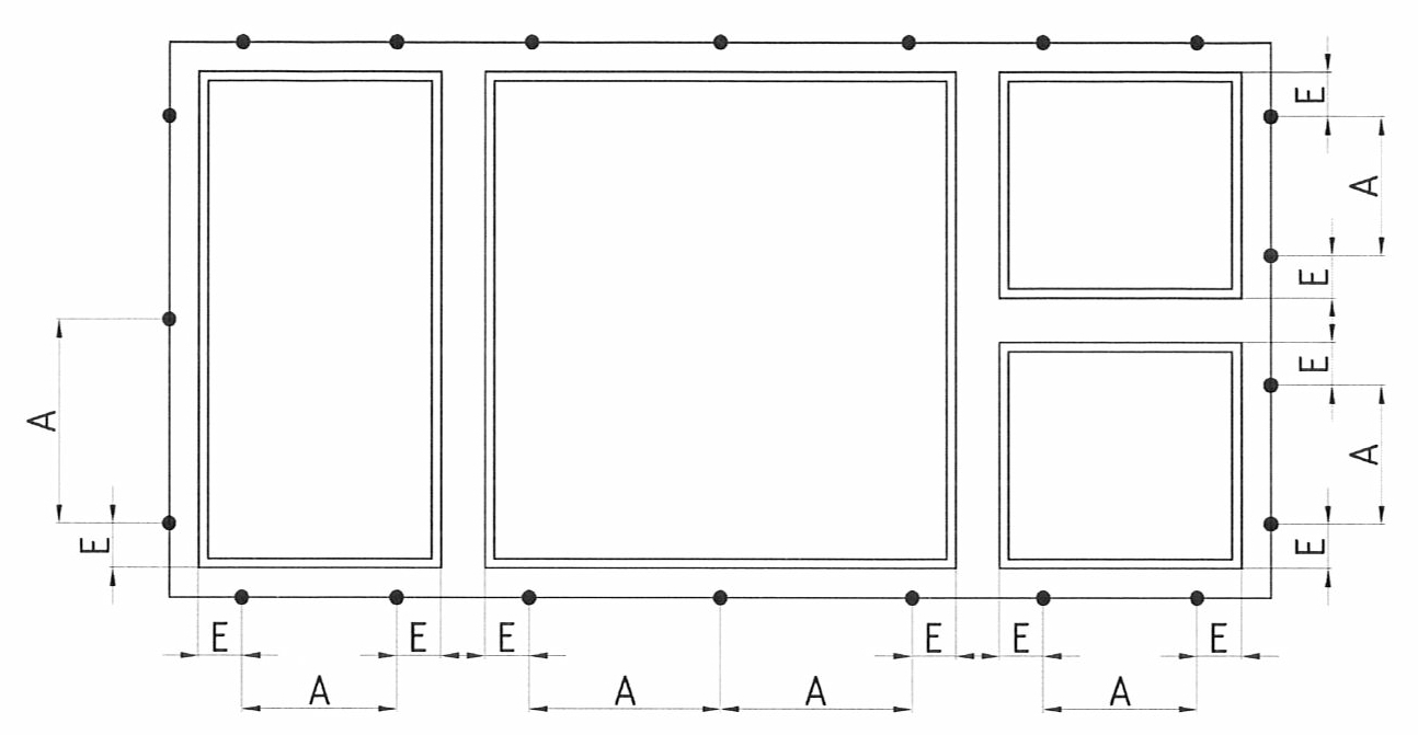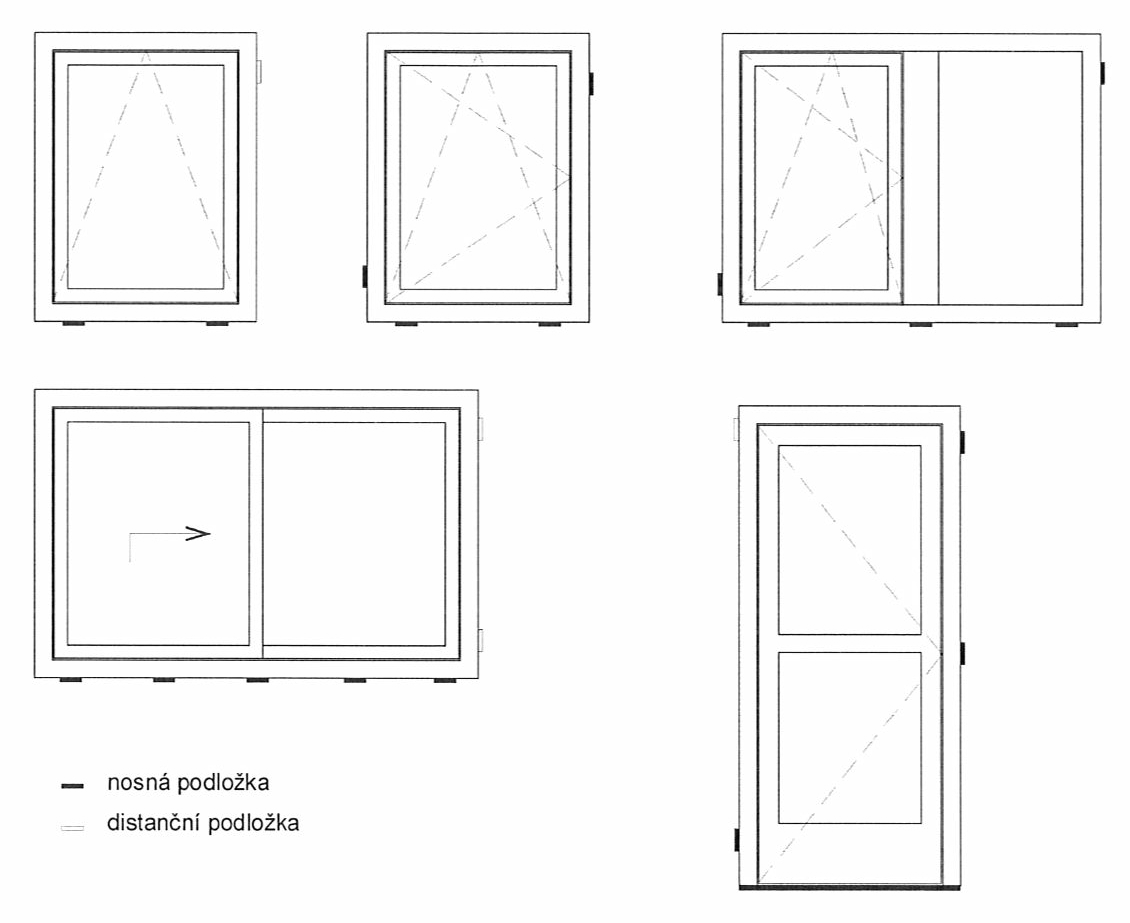 Umístění kotvicích prvků musí být navrženo a provedeno tak, aby bylo zabezpečeno přenesení sil od namáhání výrobku do konstrukce stavby a současně umožněny dilatační pohyby výrobku. Kotvení nesmí být umístěno proti spojům příčníků a sloupků výrobku. Rozmístění podložek a odstupy kotvicích prvků uvádí obrázky.