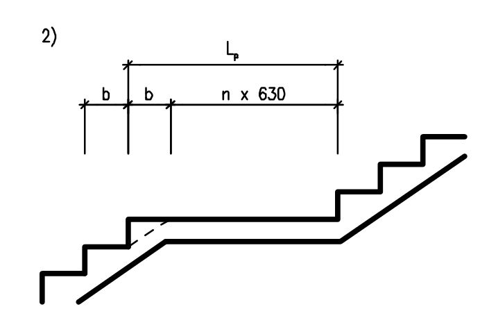 2) Vložená podesta mezi dvěma schodišťovými rameny musí mít délku v násobku 630 mm zvětšenou o šířku přilehlého výstupního stupně, mezi dvěma rameny šikmé rampy musí mít délku min. 1500 mm.