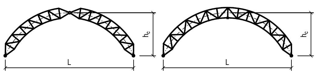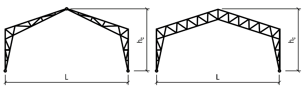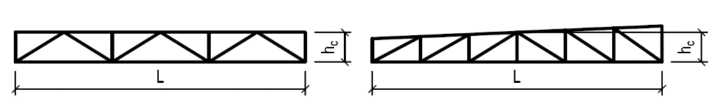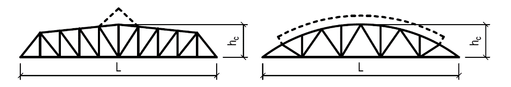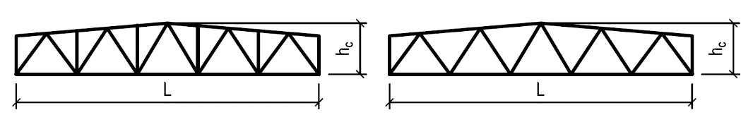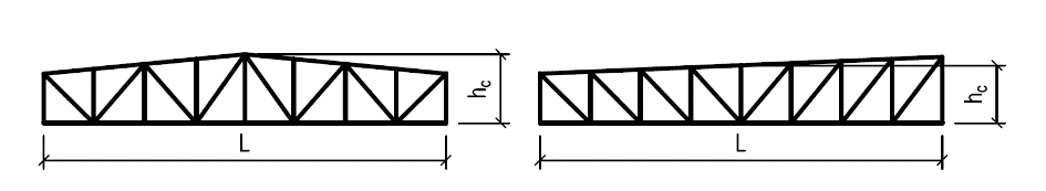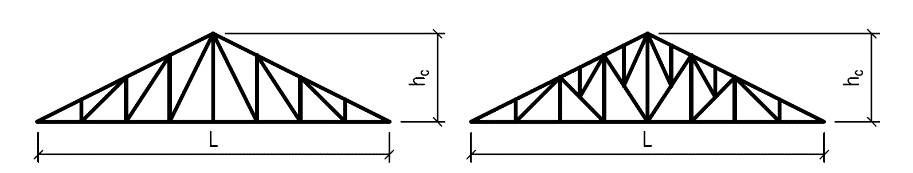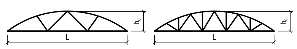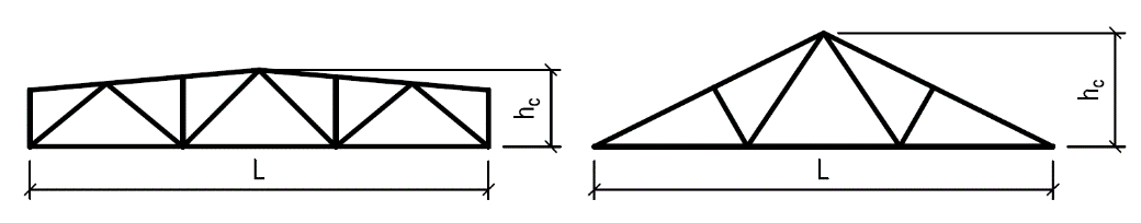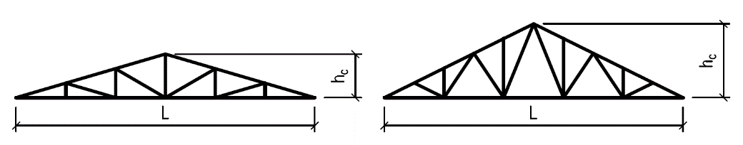 Přehled typů dřevěných příhradových konstrukcí používaných pro zastřešení s uvedením vhodného rozpětí a poměru výšky k rozpětí: