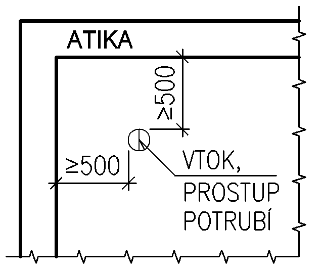 - Vtoky a prostupy potrubí se nemají umísťovat do závětrných koutů střech, do bezprostřední blízkostí atik nebo jiných nadstřešních konstrukcí. Vzdálenost hrdla vtoku od těchto míst musí umožnit osazení vtoku, má být nejméně 0,5 m tak, aby bylo možné provést spolehlivé opracování detailu vrstvami střechy, především vodotěsnicí vrstvou.