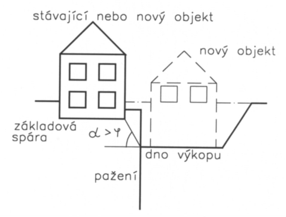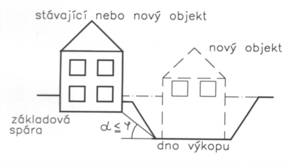 - b) Pokud je výkop v blízkosti stávajícího (obr. 1) nebo nového objektu nebo inženýrské sítě (obr. 3) a dno výkopu je níže než základová spára objektu nebo dno IS. Kritériem je smyková plocha pod úhlem vnitřního tření zeminy φ.
